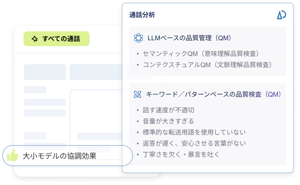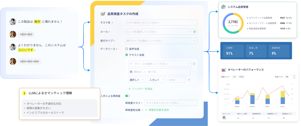 LLMベースのセマンティック品質検査技術により、会話の背後にある深層的な意図や意味を正確につかみ、従来の品質検査では見逃されがちな違反行為を高精度で検知します。精度は 最大96% に達し、違反の早期発見とより正確な品質管理を可能にします。