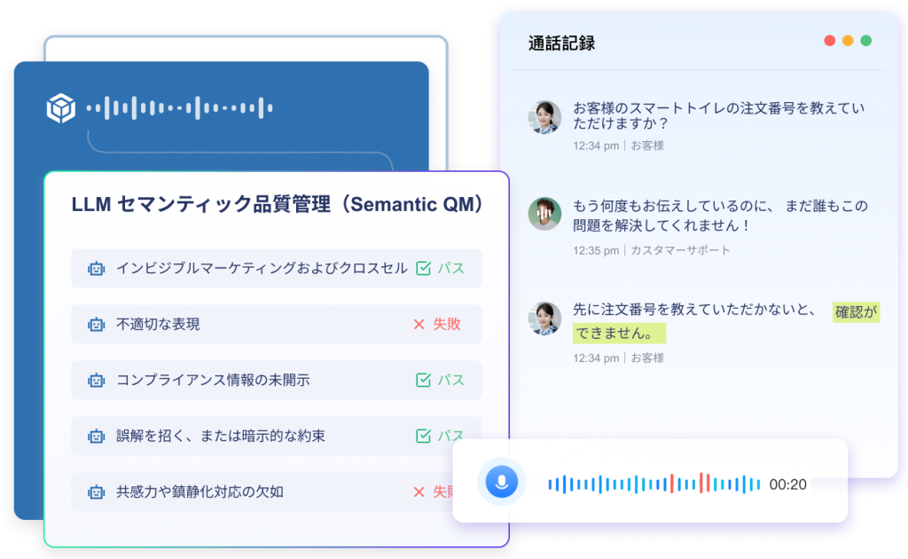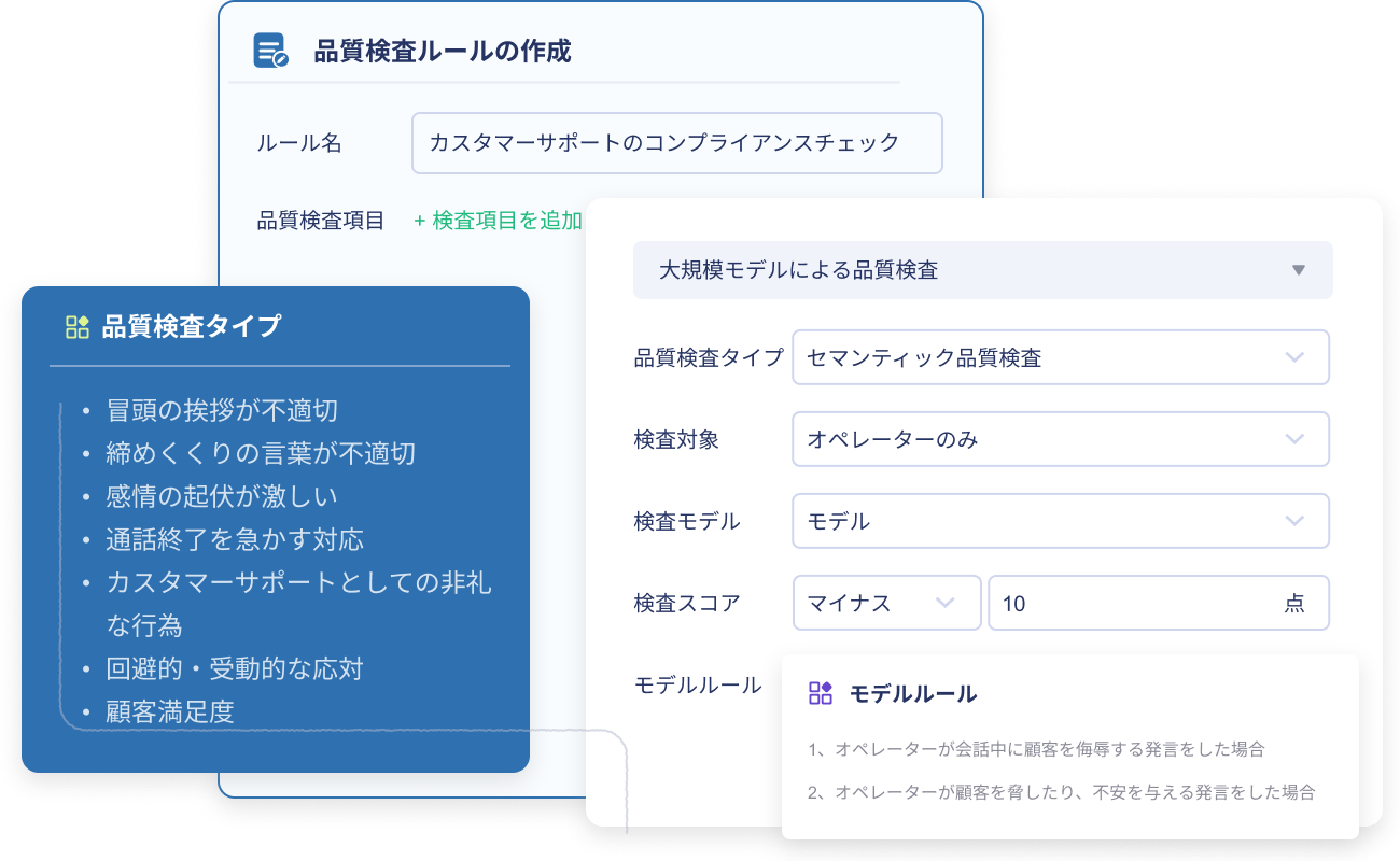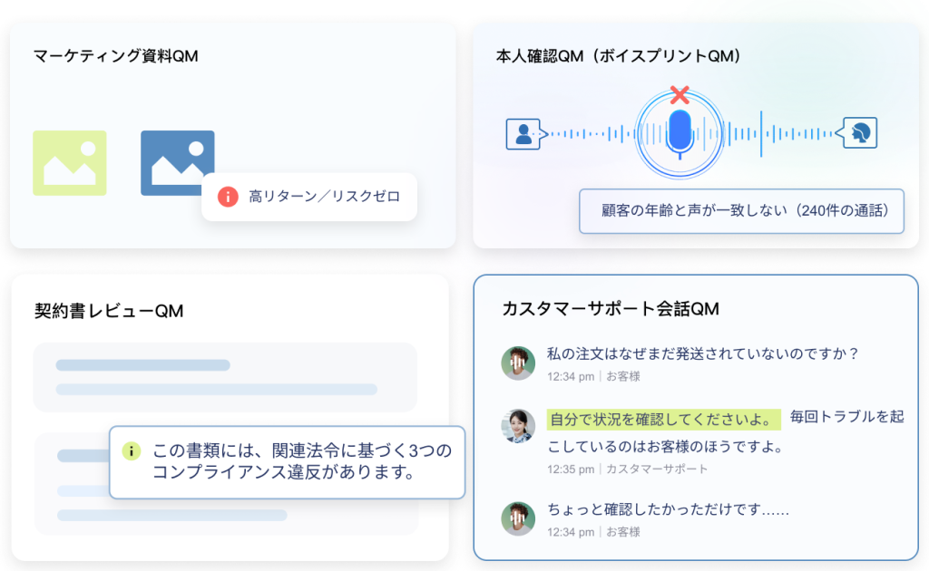 カスタマーサポートの会話、契約書レビュー、マーケティング資料、本人確認プロセスなど、全プロセスをカバーし、漏れのない品質モニタリング(QM)を実現します。
